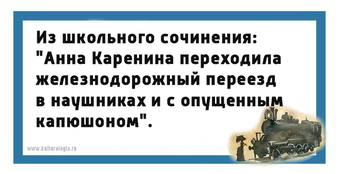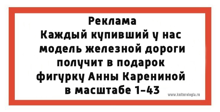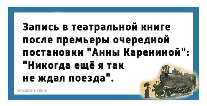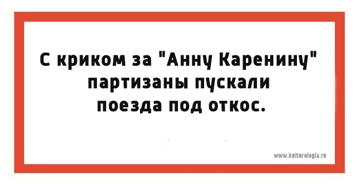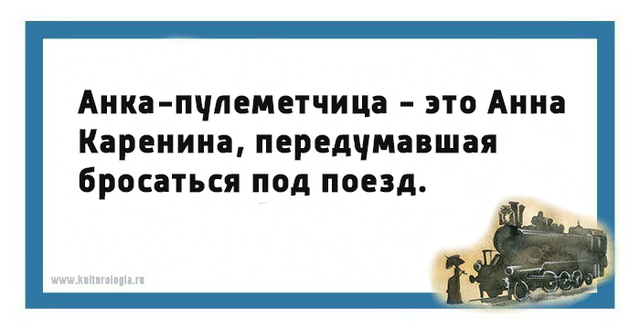 Пожалуй, каждое всемирно известное литературное произведение становится не только объектом притяжения, вдохновения и восхищения, но и целью для едких (впрочем, иногда и добрых) шуток. В этом обзоре — юмористические открытки по мотивам романа «Анна Каренина». Не стоит относится к ним чересчур серьёзно.