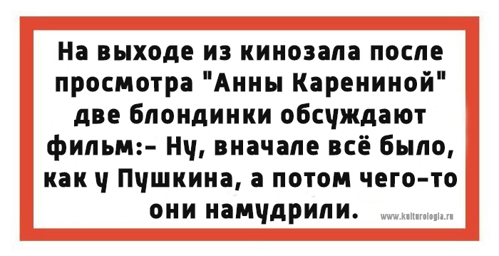 Пожалуй, каждое всемирно известное литературное произведение становится не только объектом притяжения, вдохновения и восхищения, но и целью для едких (впрочем, иногда и добрых) шуток. В этом обзоре - юмористические открытки по мотивам романа «Анна Каренина». Не стоит относится к ним чересчур серьёзно.Кстати, у автора романа в реальной жизни была...