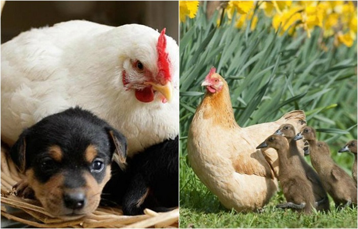 Ох, неслучайно чересчур заботливых мамочек называют наседками. В этом убеждаешься, когда видишь фотографии, главные героини которых курицы всех мастей и различных пород. Кажется, что мамы-курицы готовы вырастить любого малыша. И совсем неважно, что у него нет клюва и крыльев.
