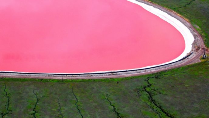 Своим розовым цветом озеро обязано галобактериям, способным жить в среде с высоким содержанием солей.