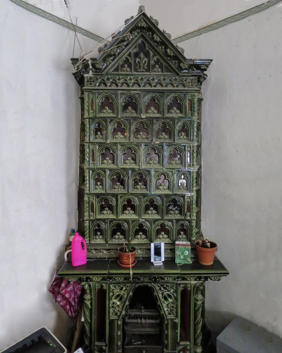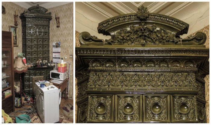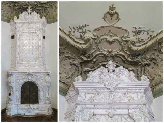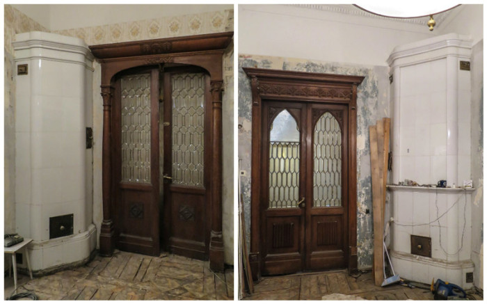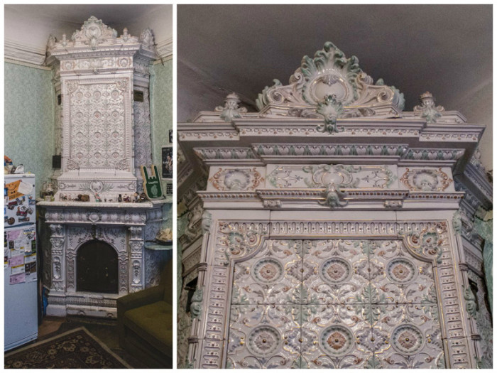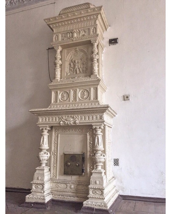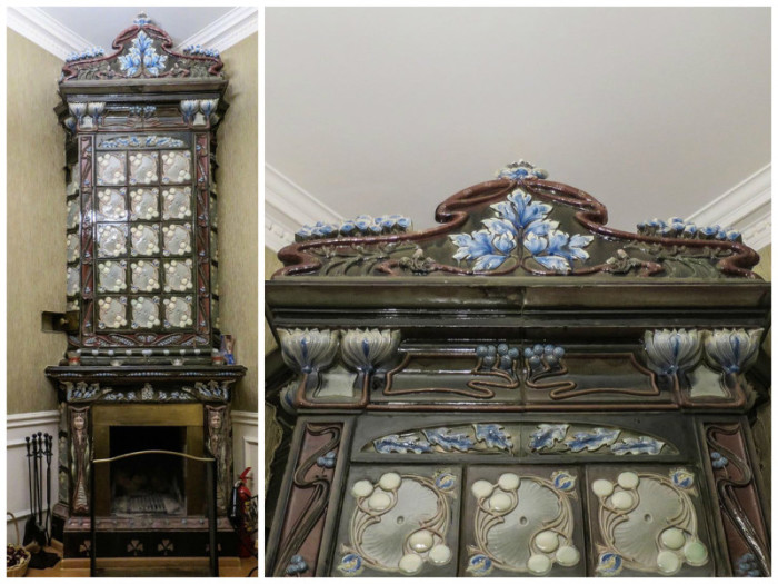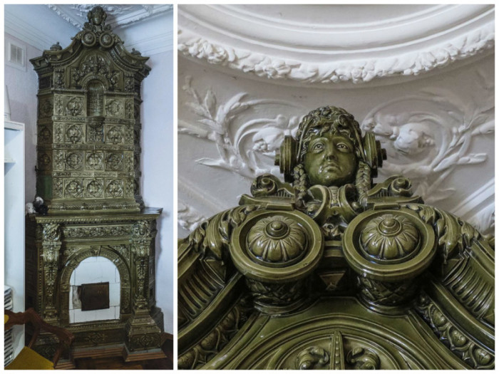 Фасадные залы с двустворчатыми резными дверями и витражными стеклами обогревались лаконичными белыми изразцовыми печами.