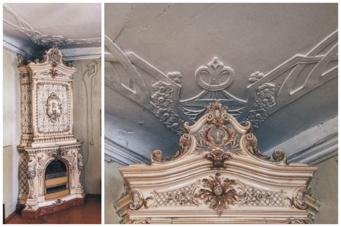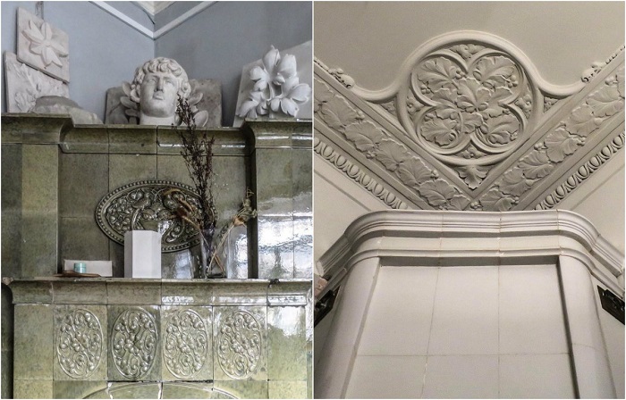 Комната, сохранившая удивительный лепной потолок и эклектичный изразцовый камин.