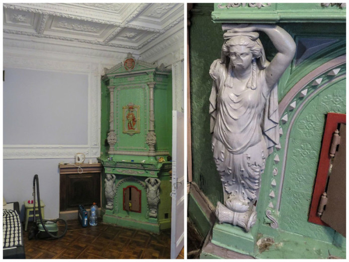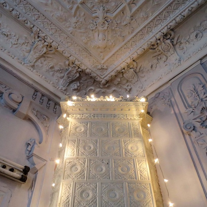 Комната с отреставрированной изразцовой печью и цветной потолочной лепниной.