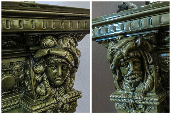 Изразцовый камин финляндского завода «АБО» с навершием в виде женской головы.