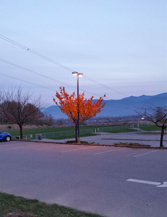 Из-за света, падающего от фонарного столба, дерево не сбросило нарядные листья.