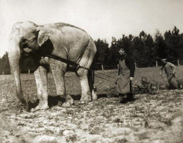 Слон из зоопарка, запряженный в плуг. Окрестности Софии, Болгария, 1910 год.