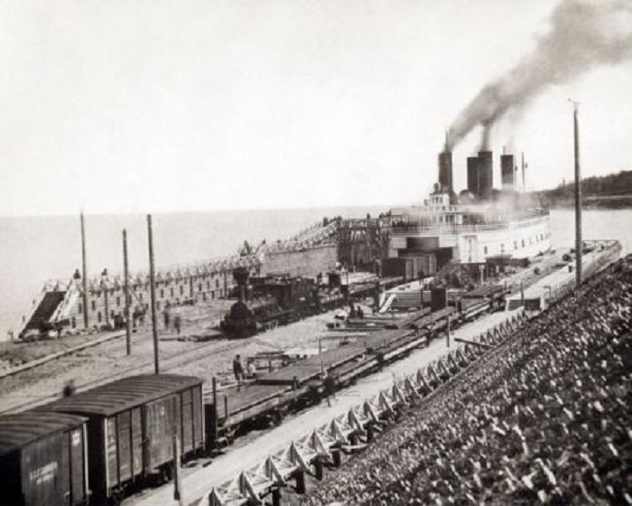 Разгрузка ледокола-парома на Байкале в 1903 году.