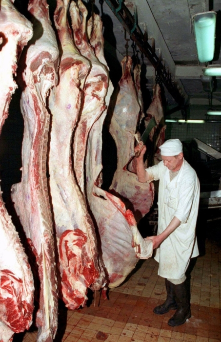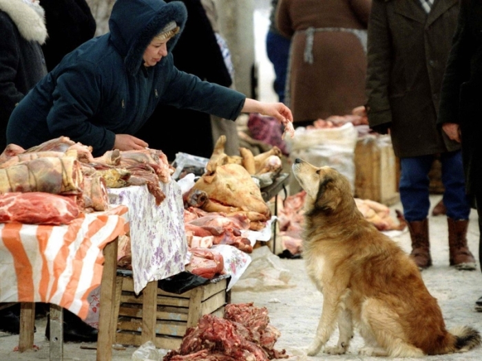 15. Женщина, торгующая мясом, подкармливает бродячего пса