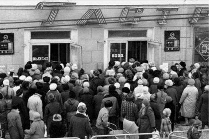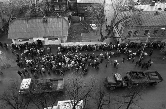 Очередь за товарами первой необходимости. СССР, Пермь, 1991 год.