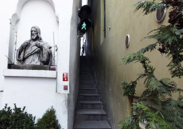 Один из семи сохранившихся пожарных проходов превратился в самую узкую улицу города, оборудованную для удобства сфетофором.